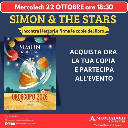 Mercoledì 22 ottobre alle ore 18:30 Simon & the Stars presso il Mondadori Bookstore Tuscolana incontra i lettori e firma le copie del suo libro: "Oroscopo 2026. Le strade del futuro" - Piemme ACQUISTA ORA LA TUA COPIA e partecipa alla presentazione e al firmacopie!